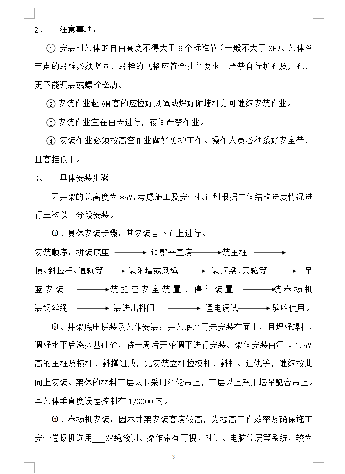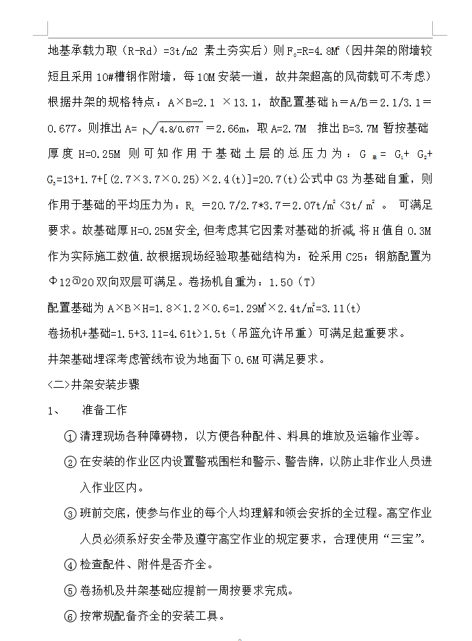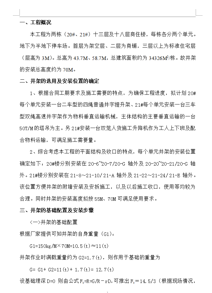 本工程为两栋(20#、21#)十三层及十八层商住楼,每栋各分两个单元。地下为半地下停车场。首层为架空层、二层为商铺,三层以上为标准住宅层(层高为3M)。总高为43.7M、58.7M,总建筑面积约为34326M2/栋。故井架的安装总高度约为70M。综合考虑本工程的平面结构及收口的特点,每个单元井架的安装位置确定如下:20#楼分别安装在20-6~20-7/20-G 轴外及20-20~20-21/20-G 轴外。21#楼分别安装在21-8~21-10/ 21-A 轴外及21-22~21-24/ 21-E 轴外。该位置方便井架的附墙安装及安拆施工,以及以后施工收口,使用等均较为合理。同时井架的安装高度拟按55M、70M可满足使用要求。
