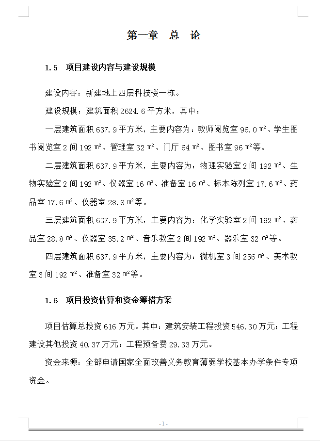 建设规模:建筑面积2624.6平方米,其中:一层建筑面积637.9平方米,主要内容为:教师阅览室96.0㎡、学生图书阅览室2间192㎡、管理室32㎡、门厅64㎡、图书室96㎡等。二层建筑面积637.9平方米,主要内容为:物理实验室2间192㎡、生物实验室2间192㎡、仪器室16㎡、准备室16㎡、标本陈列室17.6㎡、药品室17.6㎡、仪器室28.8㎡等。三层建筑面积637.9平方米,主要内容为:化学实验室2间192㎡、药品室28.8㎡、仪器室35.2㎡、音乐教室2间192㎡、器乐室32㎡等。四层建筑面积637.9平方米,主要内容为:微机室3间256㎡、美术教室3间192㎡、准备室32㎡等。