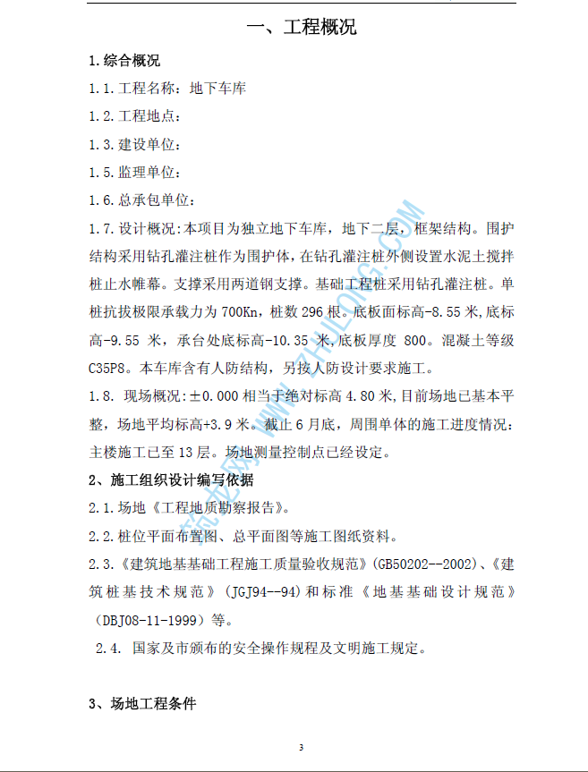 本项目为独立地下车库,地下二层,框架结构。围护结构采用钻孔灌注桩作为围护体,在钻孔灌注桩外侧设置水泥土搅拌桩止水帷幕。支撑采用两道钢支撑。基础工程桩采用钻孔灌注桩。单桩抗拔极限承载力为700Kn,桩数296 根。底板面标高-8.55 米,底标高-9.55 米,承台处底标高-10.35 米,底板厚度800。混凝土等级C35P8。本车库含有人防结构,另按人防设计要求施工。现场概况:±0.000 相当于绝对标高4.80 米,目前场地已基本平整,场地平均标高+3.9 米。截止6 月底,周围单体的施工进度情况:主楼施工已至13 层。场地测量控制点已经设定。