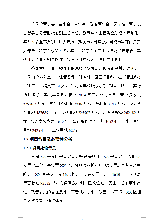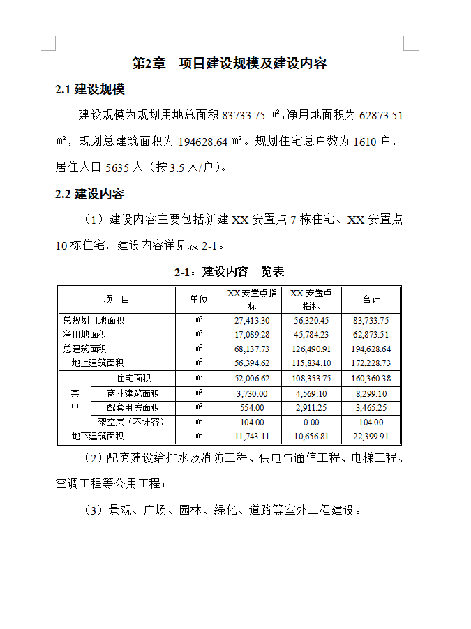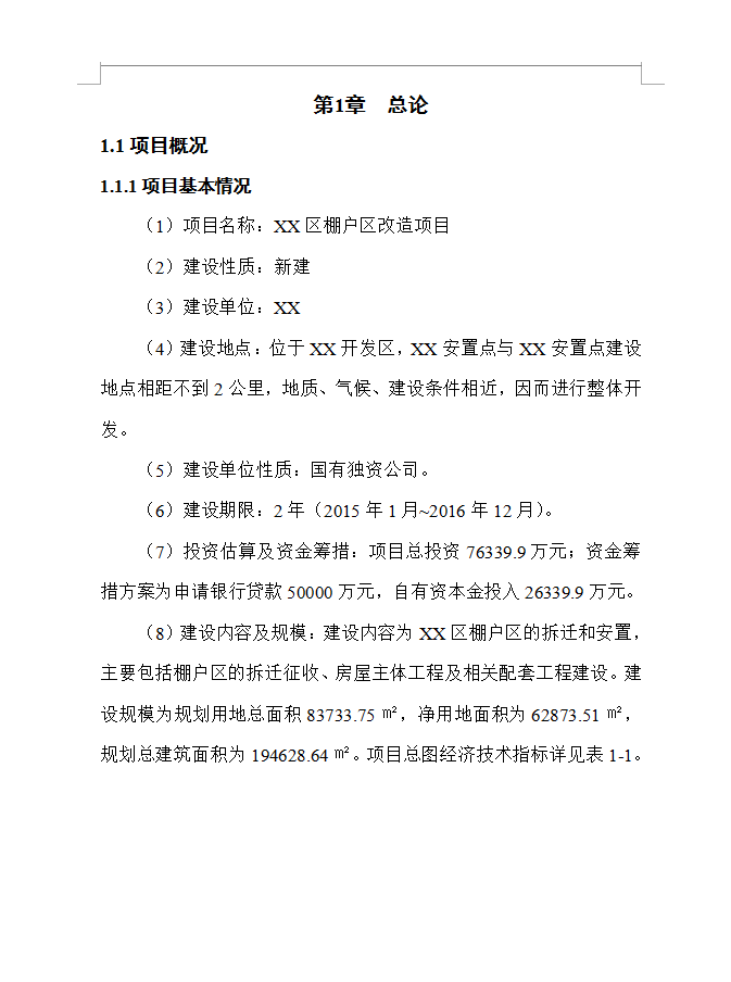建设地点:位于XX开发区,XX安置点与XX安置点建设地点相距不到2公里,地质、气候、建设条件相近,因而进行整体开发。建设单位性质:国有独资公司。 建设期限:2年(2015年1月~2016年12月)。投资估算及资金筹措:项目总投资76339.9万元;资金筹措方案为申请银行贷款50000万元,自有资本金投入26339.9万元。建设内容及规模:建设内容为XX区棚户区的拆迁和安置,主要包括棚户区的拆迁征收、房屋主体工程及相关配套工程建设。建设规模为规划用地总面积83733.75㎡,净用地面积为62873.51㎡,规划总建筑面积为194628.64㎡。项目总图经济技术指标详见表1-1。