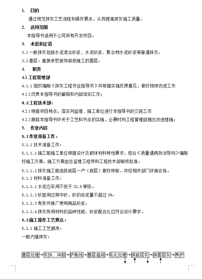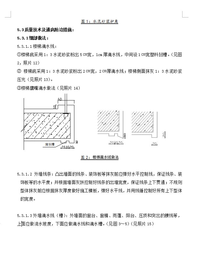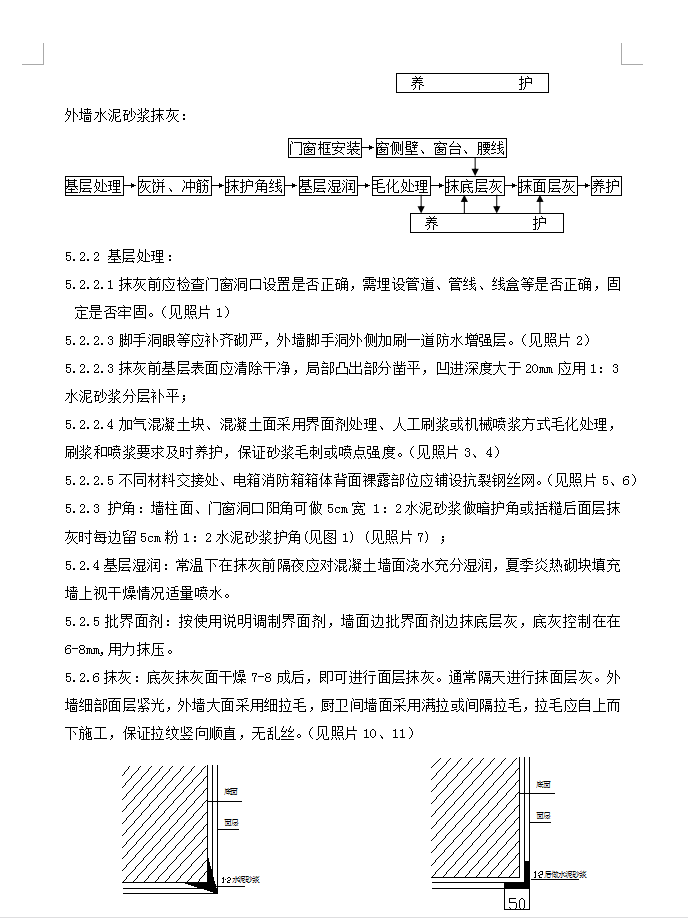 基层处理:1抹灰前应检查门窗洞口设置是否正确,需埋设管道、管线、线盒等是否正确,固定是否牢固。(见照片1)2脚手洞眼等应补齐砌严,外墙脚手洞外侧加刷一道防水增强层。(见照片2) 3抹灰前基层表面应清除干净,局部凸出部分凿平,凹进深度大于20mm应用1:3水泥砂浆分层补平;4加气混凝土块、混凝土面采用界面剂处理、人工刷浆或机械喷浆方式毛化处理,刷浆和喷浆要求及时养护,保证砂浆毛刺或喷点强度。(见照片3、4)5不同材料交接处、电箱消防箱箱体背面裸露部位应铺设抗裂钢丝网