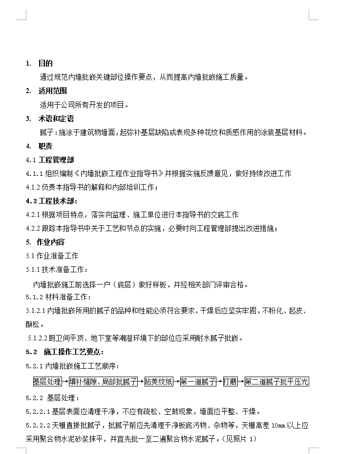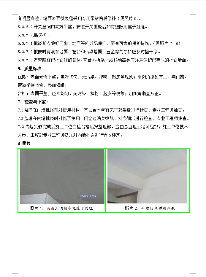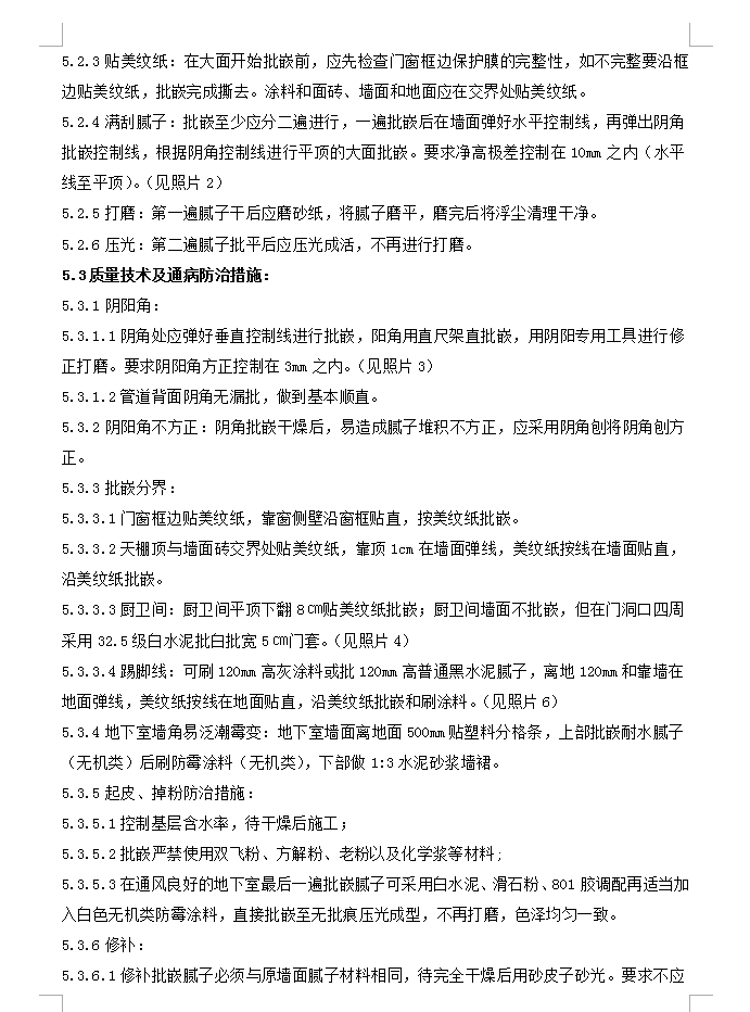 基层处理:1基层表面应清理干净,不应有疏松、空鼓现象,墙面应平整、干燥。2天棚直接批腻子,批腻子前应先清理干净板底污物、杂物等,天棚高差10mm以上应采用聚合物水泥砂浆抹平,并宜先批一至二遍聚合物水泥腻子。3贴美纹纸:在大面开始批嵌前,应先检查门窗框边保护膜的完整性,如不完整要沿框边贴美纹纸,批嵌完成撕去。涂料和面砖、墙面和地面应在交界处贴美纹纸。4满刮腻子:批嵌至少应分二遍进行,一遍批嵌后在墙面弹好水平控制线,再弹出阴角批嵌控制线,根据阴角控制线进行平顶的大面批嵌。要求净高极差控制在10mm之内(水平线至平顶)。(见照片2)5打磨:第一遍腻子干后应磨砂纸,将腻子磨平,磨完后将浮尘清理干净。6压光:第二遍腻子批平后应压光成活,不再进行打磨。