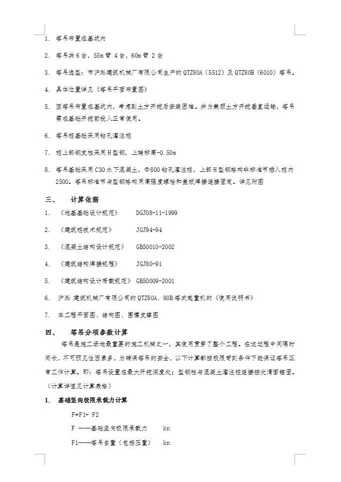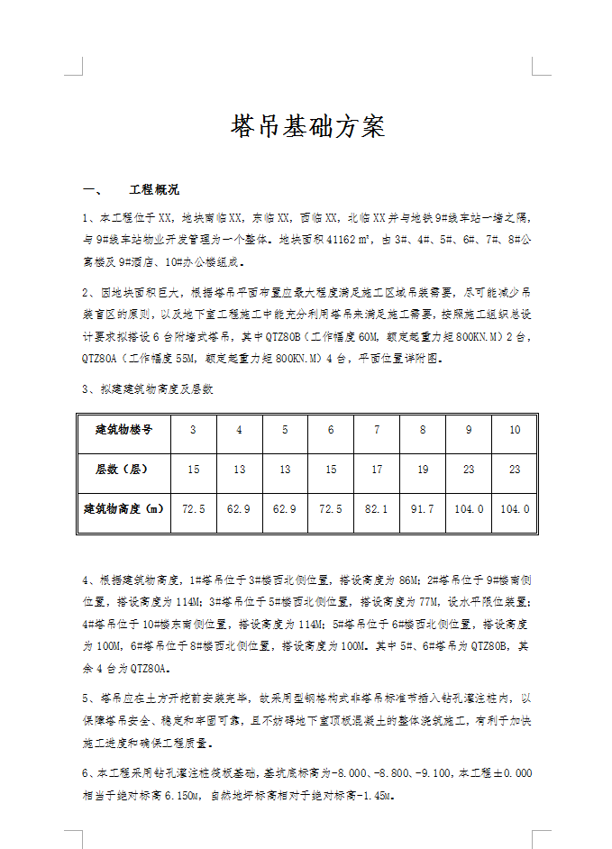 本工程位于XX,地块南临XX,东临XX,西临XX,北临XX并与地铁9#线车站一墙之隔,与9#线车站物业开发管理为一个整体。地块面积41162㎡,由3#、4#、5#、6#、7#、8#公寓楼及9#酒店、10#办公楼组成。因地块面积巨大,根据塔吊平面布置应最大程度满足施工区域吊装需要,尽可能减少吊装盲区的原则,以及地下室工程施工中能充分利用塔吊来满足施工需要,按照施工组织总设计要求拟搭设6台附墙式塔吊,其中QTZ80B(工作幅度60M,额定起重力矩800KN.M)2台,QTZ80A(工作幅度55M,额定起重力矩800KN.M)4台
