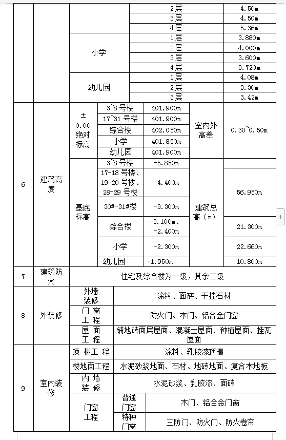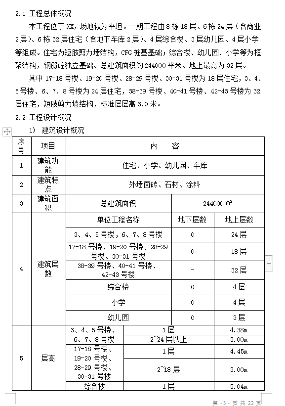本工程位于XX,场地较为平坦。一期工程由8栋18层、6栋24层(含商业2层)、6栋32层住宅(含地下车库2层)、4层综合楼、3层幼儿园、4层小学等组成。住宅为短肢剪力墙结构,CFG桩基基础;综合楼、幼儿园、小学等为框架结构,钢筋砼独立基础。总建筑面积约244000平米。地上最高为32层。其中17-18号楼、19-20号楼、28-29号楼、30-31号楼为18层住宅,3、4、5号楼、6、7、8号楼为24层住宅,38-39号楼、40-41号楼、42-43号楼为32层住宅,短肢剪力墙结构,标准层层高3.0米。