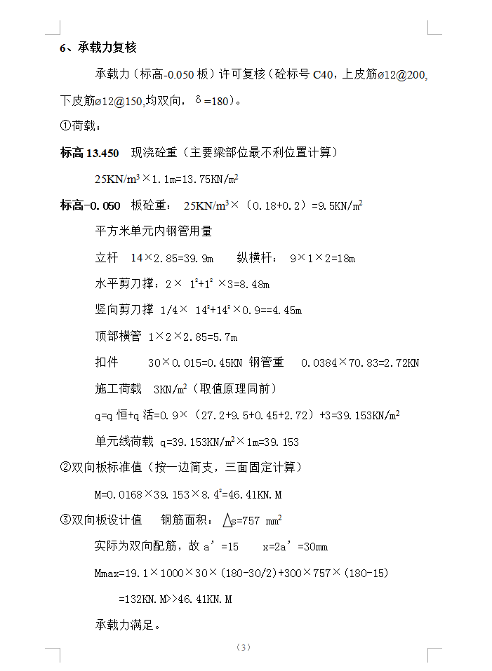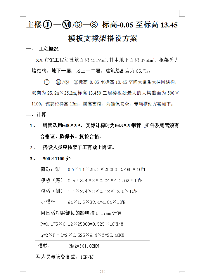 XX宾馆工程总建筑面积43185m2,其中地下面积3750m2,框架剪力墙结构,地下一层,地上十二层,建筑总高度为65.7m。⑤—⑧标高-0.05至标高13.45空间大堂系大柱网结构,双向为25.2m×25.2m,标高13.450三层楼板处最大的大梁截面为500×1100,该部位净高13m,属高支模,为确保安全