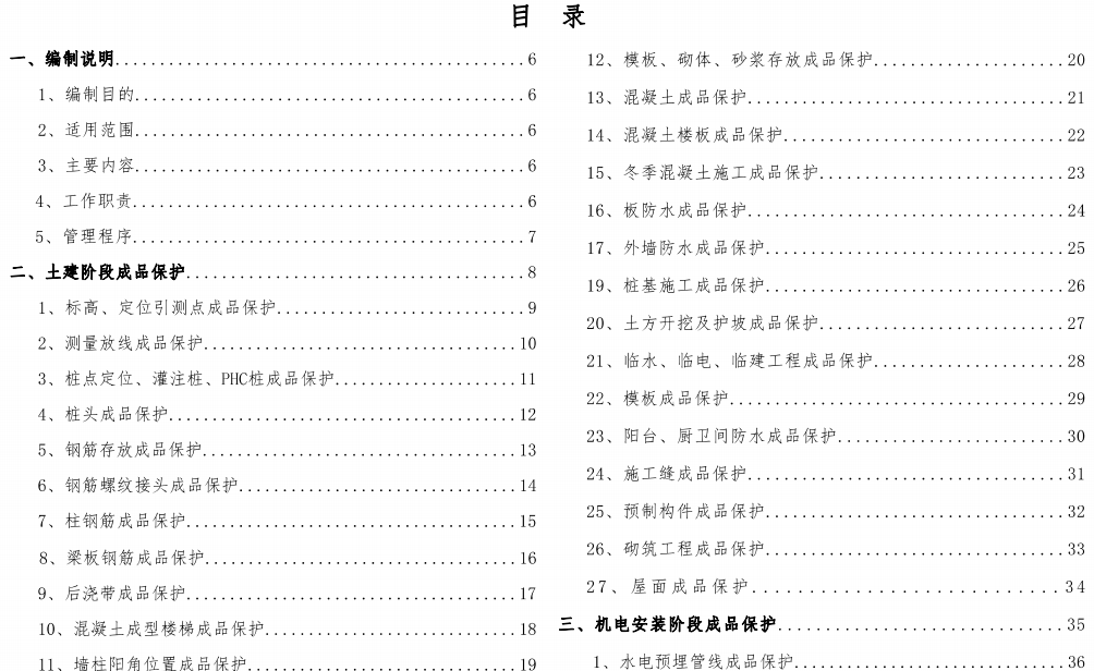本指引共分为五个部分,包括:编制说明、土建阶段成品保护、机电安装阶段成品保护、精装修阶段成品保护、园林景观阶段成品保护