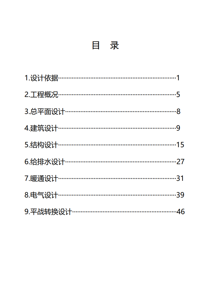 本指南正文共分为 9 个部分。主要内容有设计依据、工程概况、总平面设计、建筑设计、结构设计、给排水设计、暖通设计、电气设计、平战转换设计。