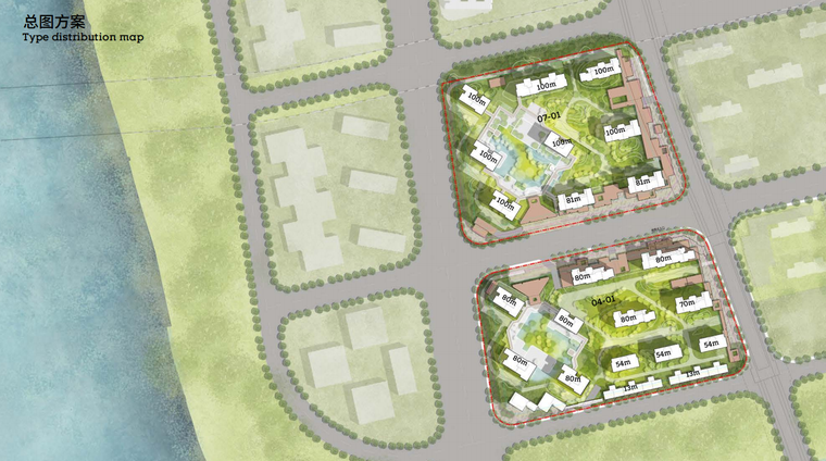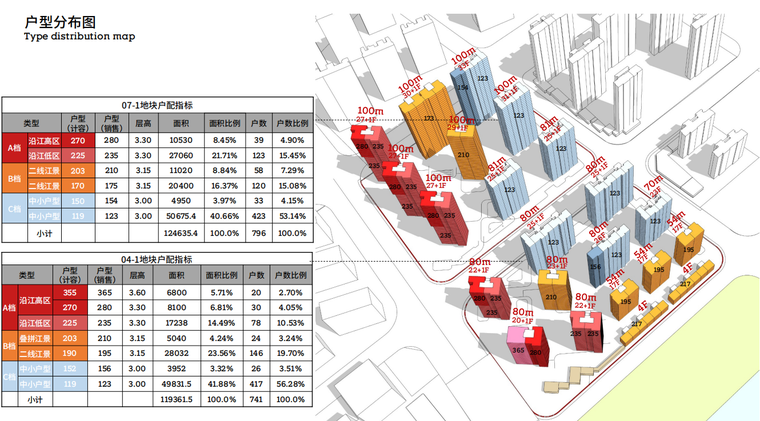 经济技术指标:总用地约 8.13 万㎡;北地块容积率 3.2、限高 100m,南地块容积率 2.9、限高 80m;两地块中小户型占比均≥40%。建筑形态:上大下小楼型,高层 + 叠墅组合,AI 优化江景布局,高低错落沿江排布。