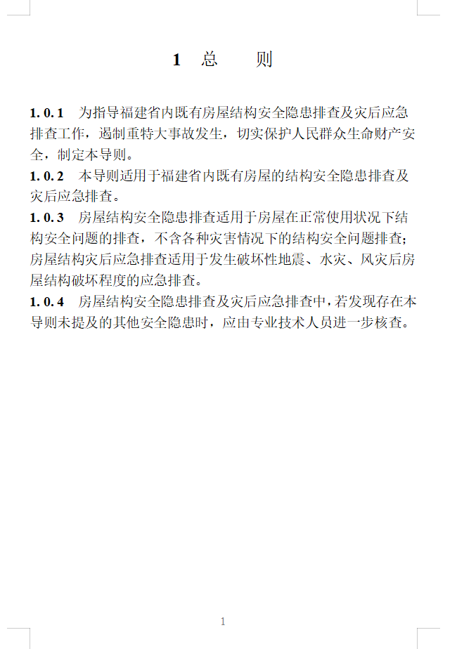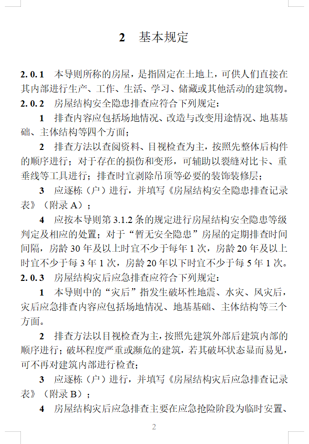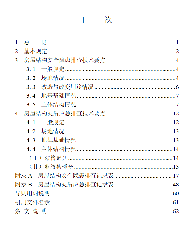 本导则的主要技术内容有:1.总则;2.基本规定;3.房屋结构安全隐患排查技术要点;4.房屋结构灾后应急排查技术要点。