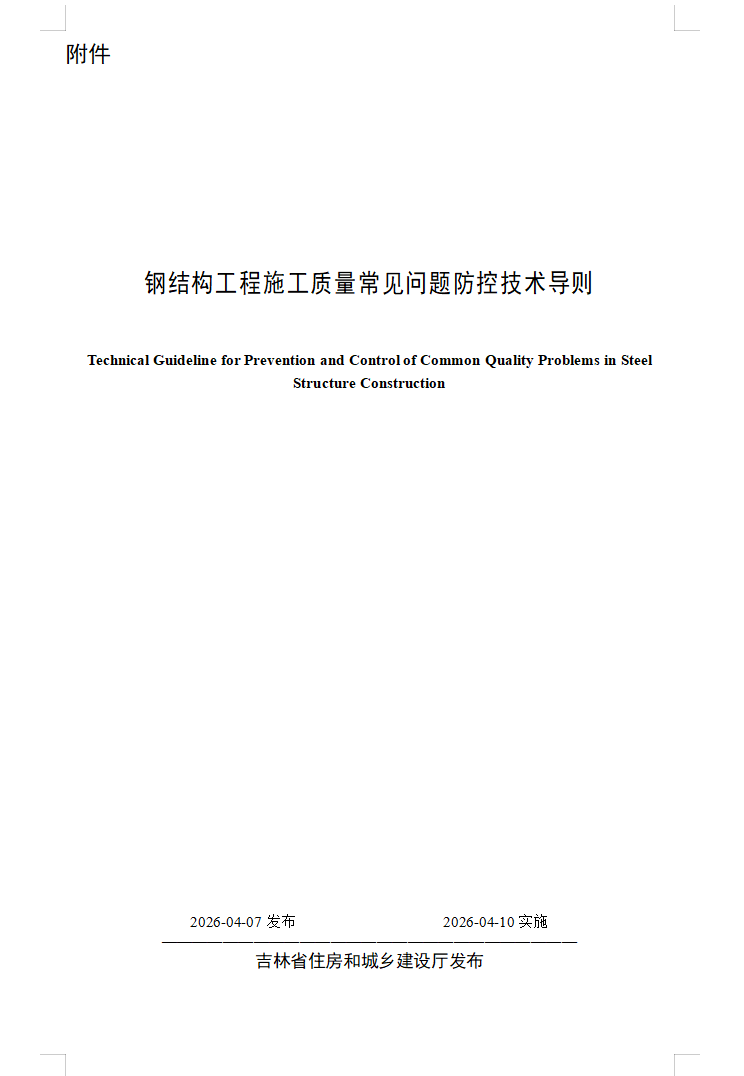 为强化我省钢结构工程施工质量管控,有效治理施工质量常见问题,保障工程结构安全与耐久性,省住房城乡建设厅组织编制《钢结构工程施工质量常见问题防控技术导则》,现予以发布,自2026年4月10日起施行。