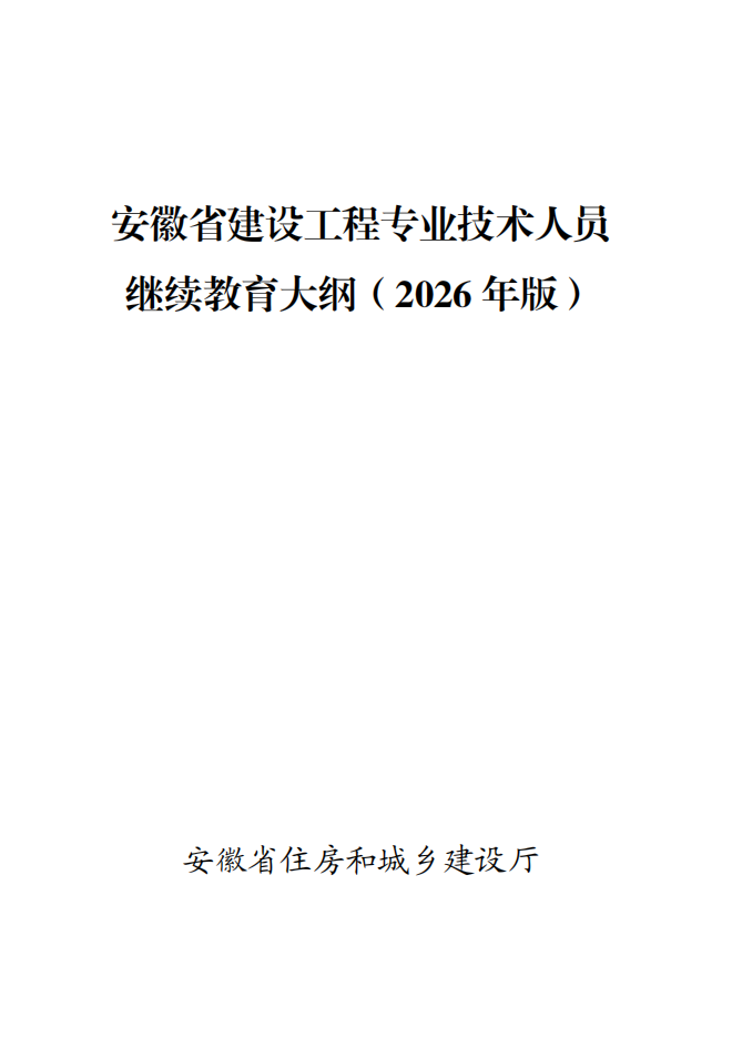 皖建人函〔2026〕72号 各市和广德市、宿松县住房城乡建设局(城乡建设局),省直有关单位,各继续教育机构: 根据《专业技术人员继续教育规定》(人力资源和社会保障部令25号),结合我省建设工程行业发展实际,我厅组织编制了《安徽省建设工程专业技术人员继续教育大纲(2026年版)》(以下简称《大纲》),现印发给你们,并就有关事项通知如下: 一、各级住房城乡建设主管部门要将《大纲》作为指导本地区建设工程专业技术人员继续教育工作的重要依据,加强对《大纲》实施情况的监督指导。 二、各继续教育机构组织开展建设工程专业技术人员继续教育,要紧扣《大纲》内容,合理设置专业课程,突出培训的针对性、实用性和前瞻性,严格执行继续教育管理的各项规定,确保继续教育规范有序开展。 三、各用人单位应积极支持并督促本单位建设工程专业技术人员按有关规定参加继续教育,为专业技术人员参加继续教育提供便利,并将继续教育情况作为岗位聘用、职称申报、考核评价等的重要依据。 四、建设工程专业技术人员应按照有关规定,对照《大纲》要求,自觉参加继续教育学习,不断提升业务能力和综合素质,适应行业高质量发展和专业技术岗位需要。 附件:安徽省建设工程专业技术人员继续教育大纲(2026年版) 2026年4月7日 点击下载: 安徽省建设工程专业技术人员继续教育大纲(2026年版).pdf