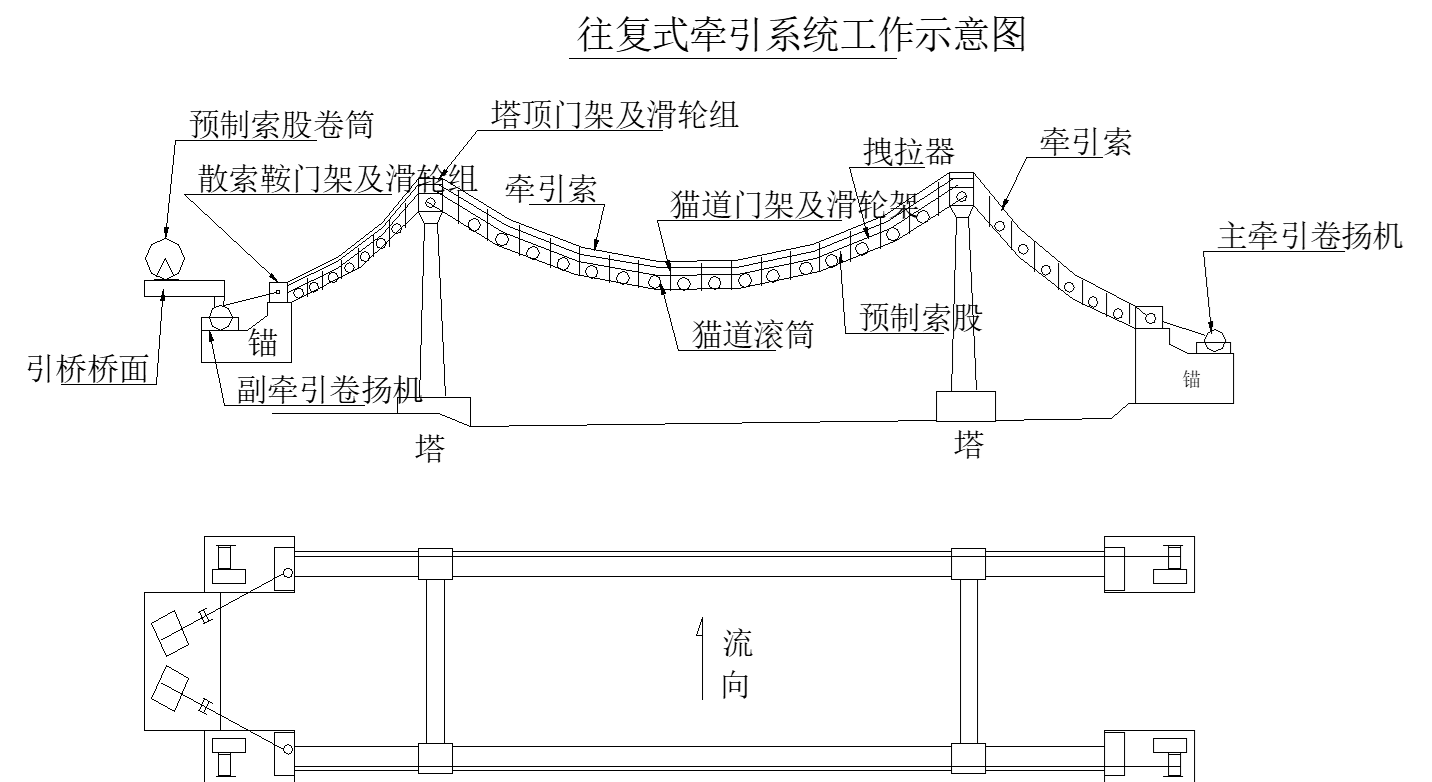 主缆常见的有钢丝绳主缆、钢铰索主缆及平行钢丝束主缆,它们的架设方法基本一致,对于目前通用的平行钢丝束主缆,则主要有空中编缆AS法和预制平行索股PWS法两种架设方法。
