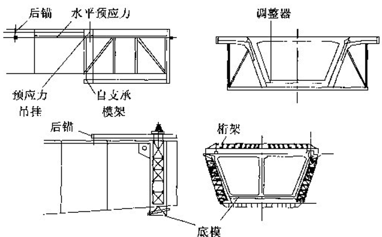 挂篮通常都有以下几个组成部分:承重结构、悬吊系统、锚固装置、走行系统和工作平台。挂篮的主要功能包括支撑模板,承受新浇混凝土重量,由工作平台提供张拉、灌浆的场地,调整高程。因此挂篮不仅要求有足够的强度保证,还要有足够的刚度及稳定性,自重轻,移动灵活,便于调整高程等。