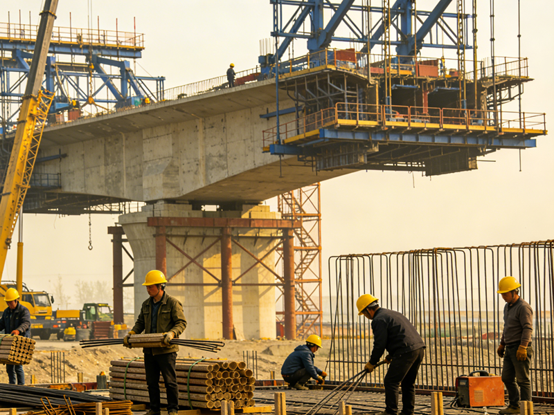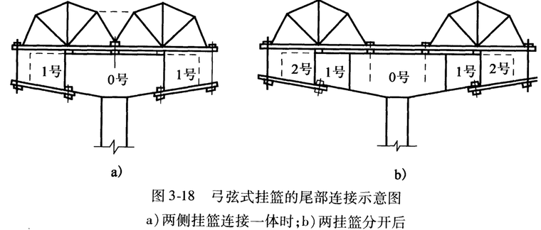 菱形挂篮组成:菱形桁架、悬吊系统、走行系统、模板系统及张拉操作平台五部分。菱形桁架:挂篮的主要承重结构。主桁构架竖放于箱梁腹板位置,构架的片数可根据主梁的截面特性来确定。悬吊系统:由螺旋千斤顶、扁担梁、吊带或吊杆组成,用于悬挂模板系统,调整模板的高程。模板系统:由外侧模、内模和底模等几部分组成。