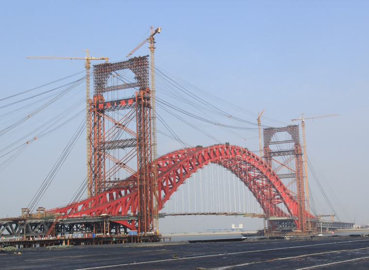主桥采用中承式双层全焊接钢桁架拱桥,跨径布置为80m+336m+80m,上层桥面宽33m,下层桥面宽12m。主跨中间108m范围内设置下层纵移桥架,纵移打开后可满足500t级海轮通航要求。主桥采用三跨连续支承体系。主墩采用固定支座,其余各墩均采用纵向活动支座。