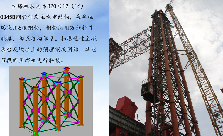吊塔全高约26m,横桥向长度42m,顺桥向宽度4m,全部采用万能杆件的空间网格结构。施工时将吊塔塔脚“系梁预收紧”(下横梁缩短2cm),有效改善塔架内力分布。