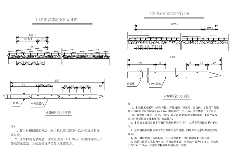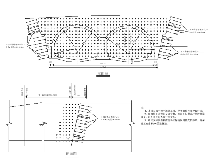 进口明洞长65m ,出口明洞长20m ,均采用钢筋砼结构。 洞身衬砌系按新奥法原理设计,初期支护采用喷、锚、网、钢拱钢架,二次衬砌采用钢筋砼衬砌,双跨连拱中隔墙采用钢筋砼,同时视地层、地质条件增加管棚、超前锚杆等预加固措施,洞口偏压、浅埋地段结合地质条件采取地表砂浆锚杆、反压回填等工程措施。