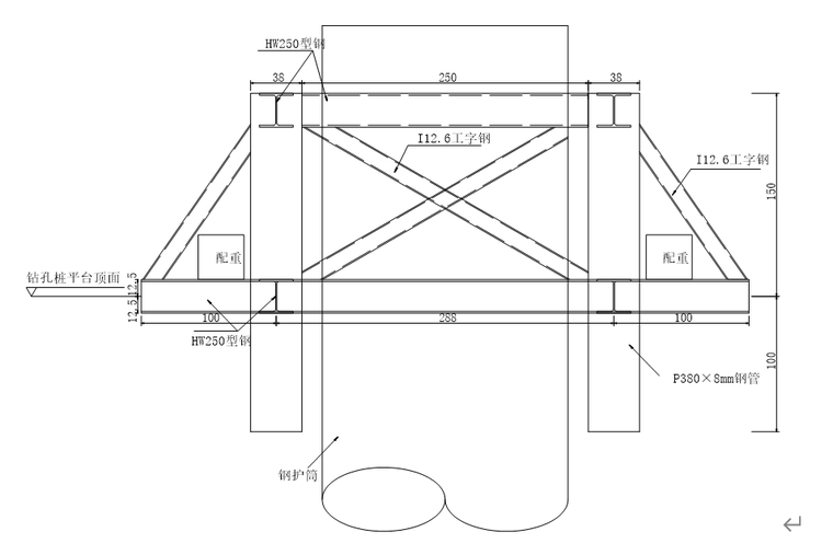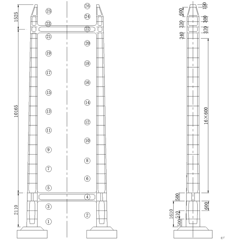 本大桥长2287m,桥跨布置为:23×30+(40+175+410+175+40)+25×30m,主桥桥型为双塔双索面钢-混组合梁斜拉桥,长度840m。主桥上部结构为双塔双索面钢-混组合梁斜拉桥,辅助墩采用3.0×2.5m实心墩,4根Φ1.5m钻孔桩基础,承台6.4×6.4×2.5m;主桥侧共用墩采用2.6×2.4m实心墩,6根Φ1.5m钻孔桩基础,承台14.7×6.4×3.0m;索塔采用H型索塔,单箱单室空心箱型截面,A侧塔高为138.0m,基础采用40根直径Φ2.0m钻孔桩,桩长96m,承台24.0×18.9×5.0m,索塔塔座高2.0m,顶面16.0×10.9m,底面20.0×14.9m;索塔两侧双索面扇形布置16对斜拉索,斜拉索塔端锚固于中塔柱钢锚梁上,梁端锚固于主梁钢锚箱上,两端均采用张拉端冷铸墩头锚。