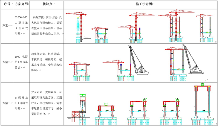 首先采用浮吊进行主塔水中工作平台的搭设,同时利用履带吊采用钓鱼法进行两岸栈桥的搭设;桩基础采用大功率液压反循环钻机进行钻孔施工,水中大体积砼承台采用拉森钢板桩围堰进行施工。主桥墩身砼段采用悬臂模板进行提升浇筑,钢塔段采用大型塔吊进行吊装。主梁0、1号段采用落地钢管少支架与挂篮相结合进行浇筑,主梁2~17号段采用前支点挂篮进行对称悬臂浇筑,边跨现浇段采用悬臂少支架法进行浇筑,合龙段采用吊架法进行施工。