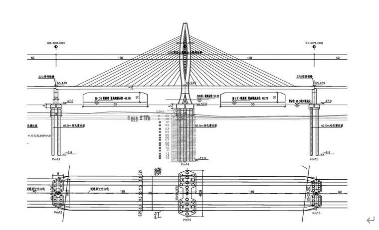桥梁总长1310m,跨径组合为:5×40+2×(4×40m)+2×110m+6×40m+45+60+45+2×(3 ×30m),通航孔采用(110+110m)斜拉桥,主梁采用预应力混凝土双肋式断面,梁高3m。吊杆采用平行钢丝斜拉索。支撑体系为塔、梁、墩固结,边墩墩顶设球形钢支座。采用钢-混凝土组合塔身,钻孔灌注桩、悬臂挂篮浇筑施工。西岸引桥采用13跨40m先简直后连续预应力砼小箱梁,东岸引桥采用6跨先简直后连续预应力砼小箱梁,加45m+60m+45m预应力砼现浇连续梁,加两联3×30m预应力砼现浇大箱梁。主桥梁为整幅式布置,主梁标准宽度为36m,引桥标准宽度为30m。东岸为分离式,西岸为整体式。全桥采用钻孔灌注桩,主桥承台采用48.5×15×5m哑铃型整体式基础。