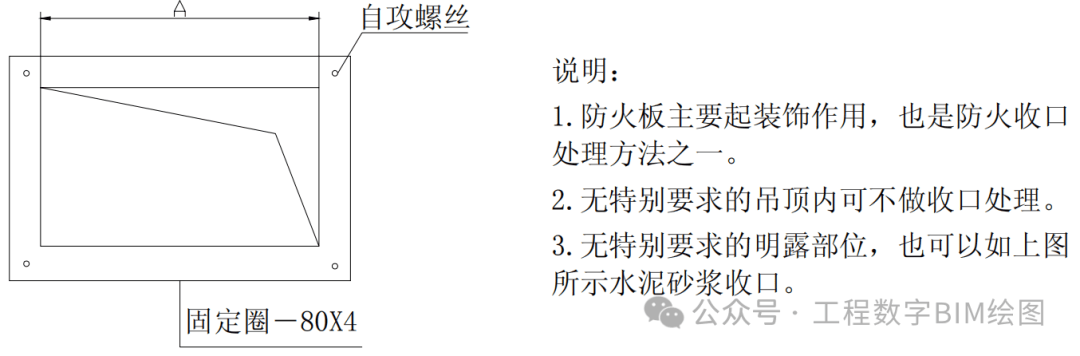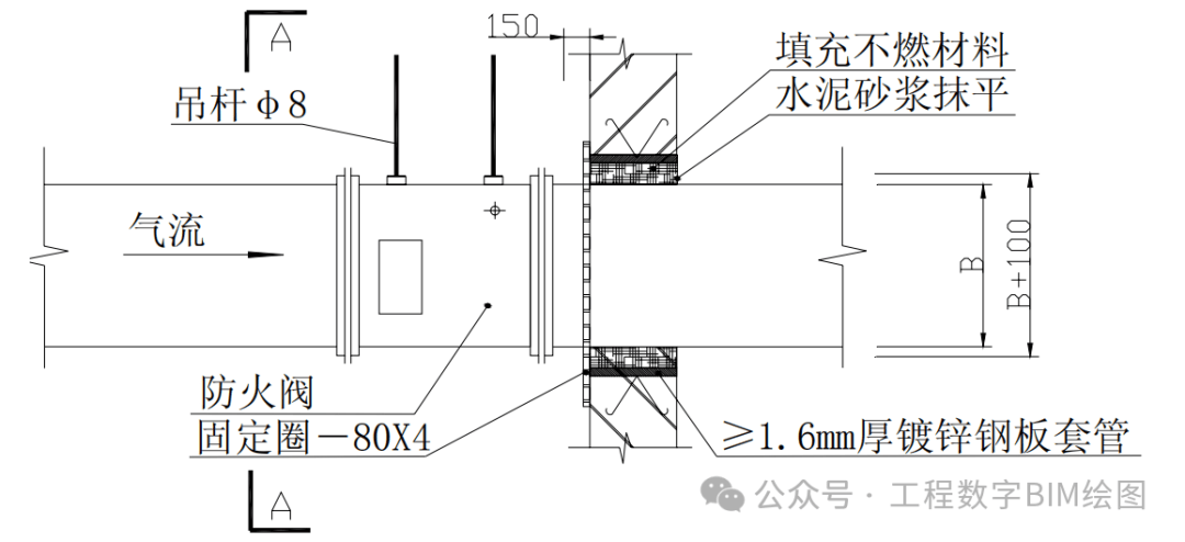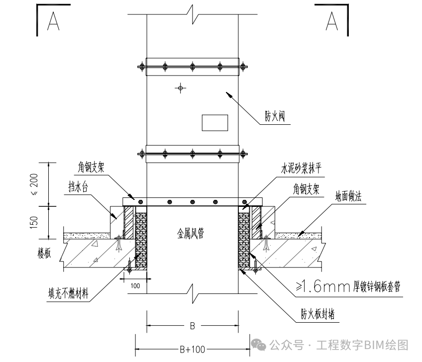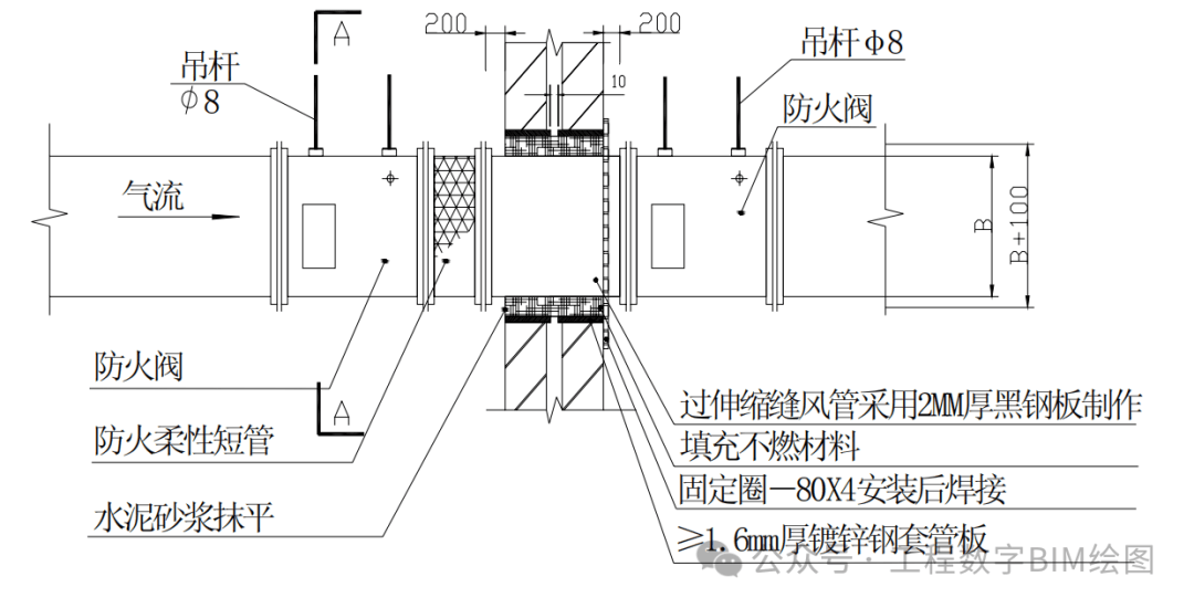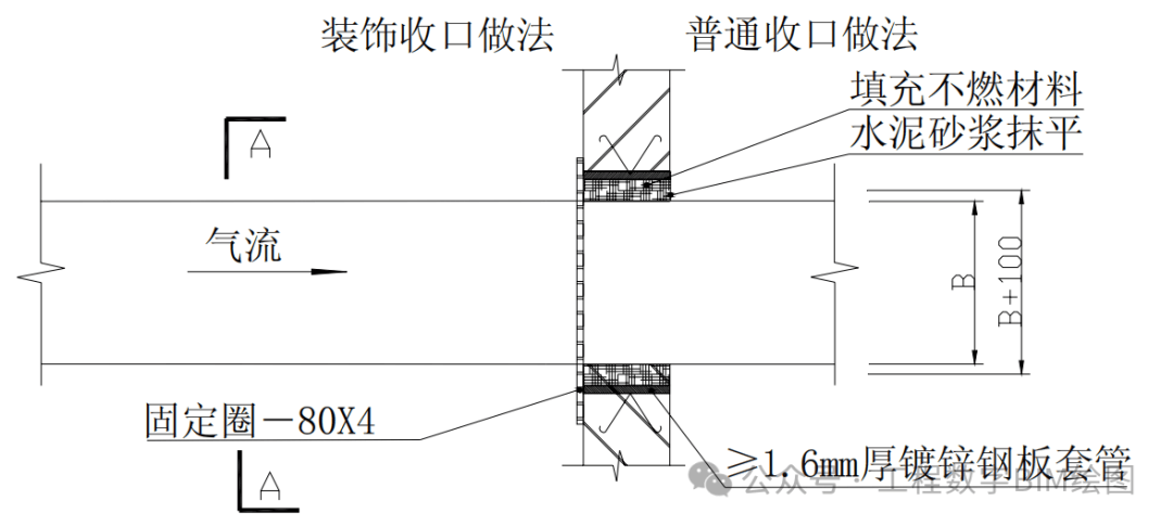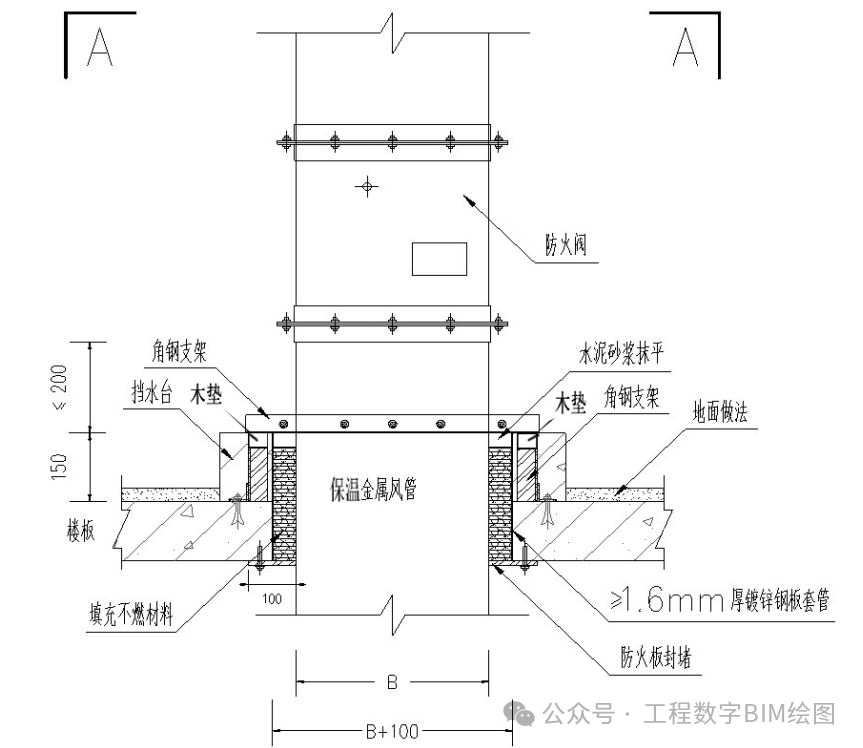 一、风管穿墙安装 1.风管穿墙安装 1.1 适用范围 根据 GB50243中6.2.1规定,在风管穿过需要封闭的防火、防暴的墙体或楼板时,应设预埋管或防护套管,其钢板厚度不应小于1.6mm。风管与防护套管之间,应用不燃且对人体无危害的柔性材料封堵。非上述隔墙可不设防护套管。 1.2 大样图 水平风管穿伸缩缝做法 水平风管穿防火墙做法 水平风管穿隔墙做法 1.3 工艺说明 1)钢套管和封堵材料应与完成面平齐;明装风管套管表面采用如上图所示得防火板封堵做法; 2)风管吊架采用双螺母锁定,螺杆露出螺杆为 2~3 扣; 3)水平风管穿墙或伸缩缝预留洞口加设 1.6mm 以上钢板套管,套管内填充不然材料。风管穿墙处套管表面加设防火板封堵,在防火板四角用膨胀螺栓固定于墙体上。防火板尺寸最少大于预留洞口50mm; 4)风管及防火阀支吊架的螺孔采用机械加工; 5)本内容参见高层民用建筑设计防火规范。 6)尺寸标准(注:边长大于 2500mm的风管支吊架应按设计规定) 二、风管穿楼板安装 2.1 大样图 竖向风管穿楼板做法 A-A剖面图 保温金属风管穿楼板 2.2 工艺说明 1)竖风管穿楼板处加设挡水台,挡水台建筑做法参照设计要求。其中穿设备层、机房、出屋面楼板需做地面防水。对于成排风管穿楼板,采用一个整体挡水台。风管一边靠墙体的情况,挡水台只考虑除剪力墙的其他方向。 2)竖风管穿楼板,风管角钢支架支腿需包进建筑挡水台内固定在楼板上。 3)竖风管穿楼板预留洞加设钢板套管,套管内填充不然材料。风管穿楼板处楼板下方加设防火板封堵,在防火板四角用膨胀螺栓固定于楼板下方。防火板尺寸最少大于预留洞口50mm。 4)本内容参见高层民用建筑设计防火规范 5)尺寸标准(注:边长大于 2500mm的风管支吊架应按设计规定。)