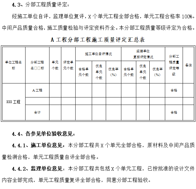 各参建单位于2025年X月XX日确认XXX工程为1个单位工程,X个分部工程,X个单元工程。本次验收的分部工程为护脚工程分部工程(编号:DAFH-1),共计X个单元工程。本分部工程X个重要隐蔽单元工程,无关键部位单元工程。