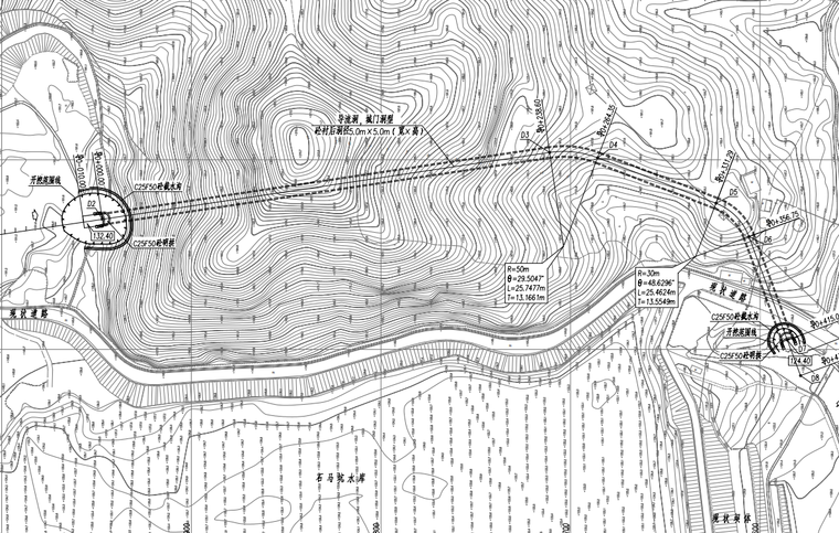 水库工程的先行工程,隧洞进口位于石马坑水库左岸上游老料场处,出口位于现状溢洪道下游。导流洞为无压泄洪隧洞,城门洞断面,衬后断面尺寸5.0m×5.0m,洞线全长415m,设计流量为121m3/s。