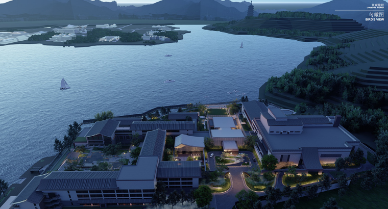 国际会都扩容提升的高端度假酒店,集会议、度假、休闲于一体的东方写意风格滨水度假酒店。总建筑面积约 4.3 万㎡,客房 240 间、套房 17 间,景观以 “三庭五院一带” 为核心布局。
